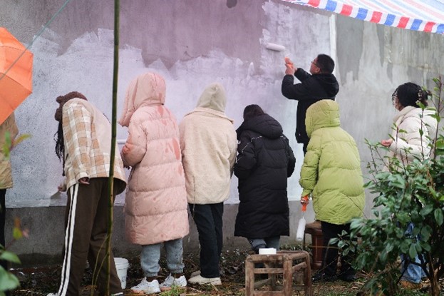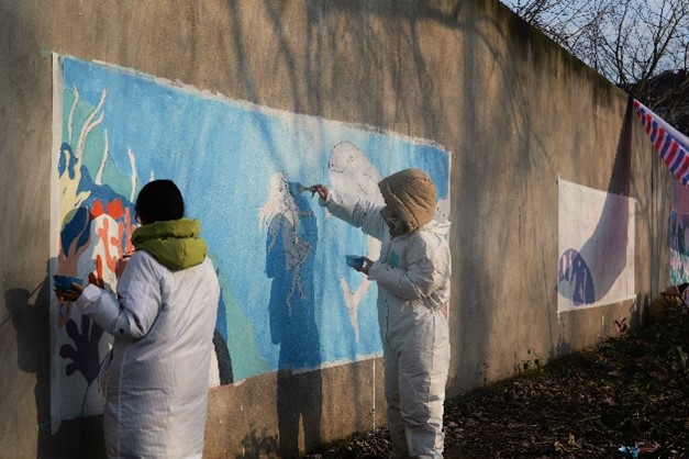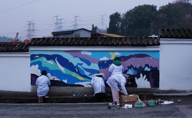 在为期一周的创作中,墙绘志愿者们顶着冬日的严寒,迎着长江之滨刺骨的寒风,不畏长期的雨水天气,在搭建的雨棚下每天创作时间超过6个小时。墙绘志愿者们从勾勒线条到调色再到上色,全身心投入墙面彩绘,一丝不苟,一幅幅栩栩如生的画卷逐步铺开。为墙壁上色的过程中,不免有颜料时常落到志愿者的头发上、手上、衣服上、鞋子上,但志愿者们并未抱怨,不顾这些污渍,继续进行着绘画。尽管墙绘任务的绘画量巨大,条件艰苦,但是志愿者们互帮互助,发挥自己的特长,以丙烯颜料、画笔为材料,精心绘画,围绕长江生态环境保护等题材进行创作,通过一幅幅墙绘传播正能量,助力乡村振兴和生态环境保护。在绘画过程中,志愿者们一同构思,讣真大胆创新内容方案,从起型到勾线,从修改到调整,志愿者们对每个部位进行仔细检查,使整体墙面和谐生动。这些墙绘不仅给村子带来了新的生机与活力,更传递出强烈的环保理念。