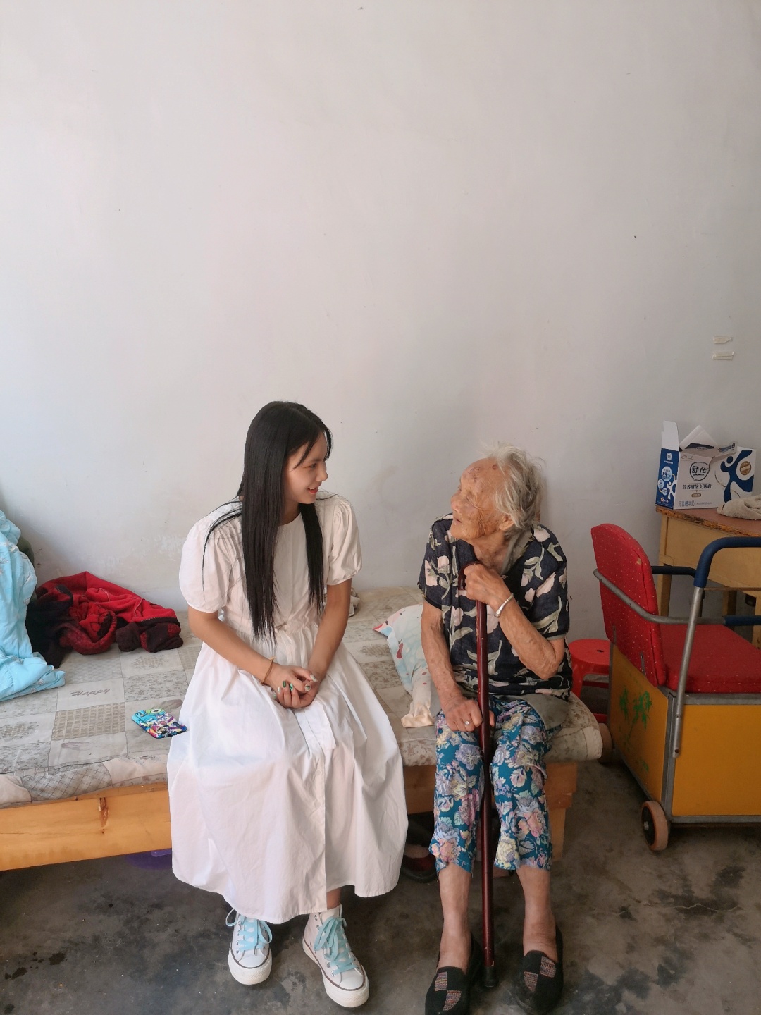 其中有一个八十多岁的老奶奶特别的激动。我坐在奶奶的床边聊了很久,我了解到奶奶腿脚行动不便,眼睛现在也不太好用,养老院的负责人就劝奶奶尽量不要外出,可能是因为奶奶一直在房间里待着,很少与人交流,很寂寞,见到我后才会格外的激动。奶奶告诉我,说她前段时间忍不住自己想出去转转,结果一不留神摔了跟头,奶奶一边说着一边指着自己的头顶让我看上次摔伤的痕迹。看到后我真的很难想象,一位八十多岁的老人在被重重的摔一跤后,地上满是血,自己又无法动弹。由于眼睛的缘故,奶奶的衣服里外穿反,我小心翼翼地帮奶奶重新穿,穿好后,奶奶高兴地说“还是这样穿舒服呢。”最后当我说该回去时,奶奶很舍不得我离开,非要起身送我,我告诉奶奶我过几天还会再来的,奶奶这才高兴起来。