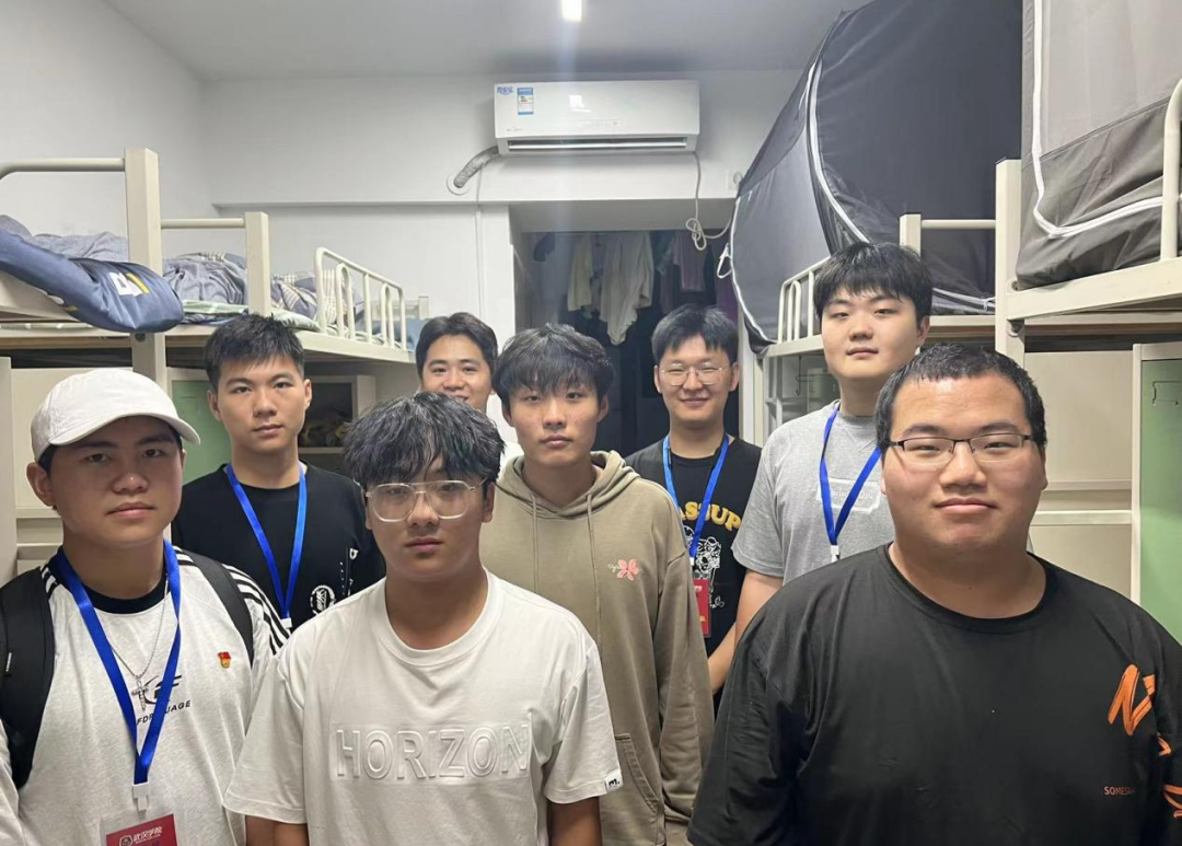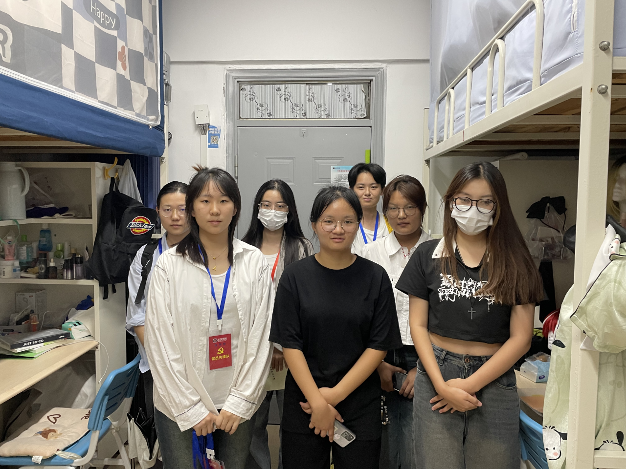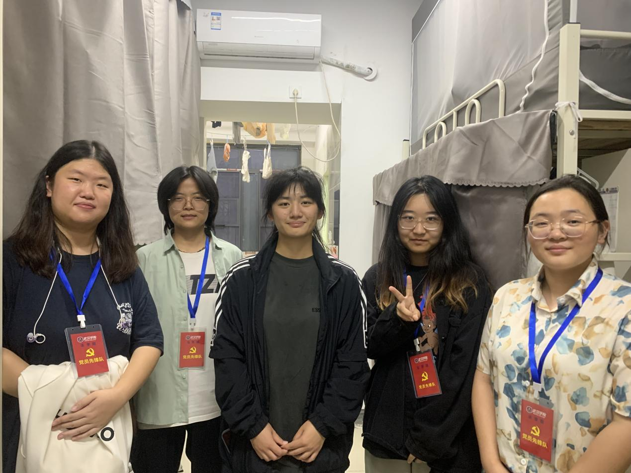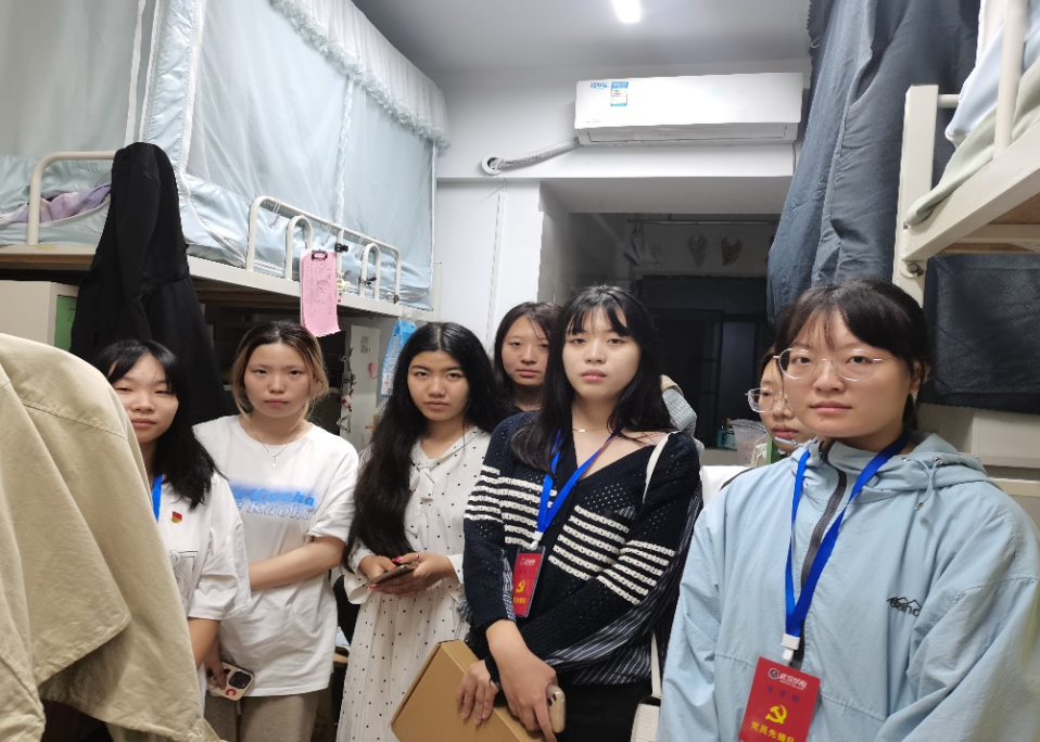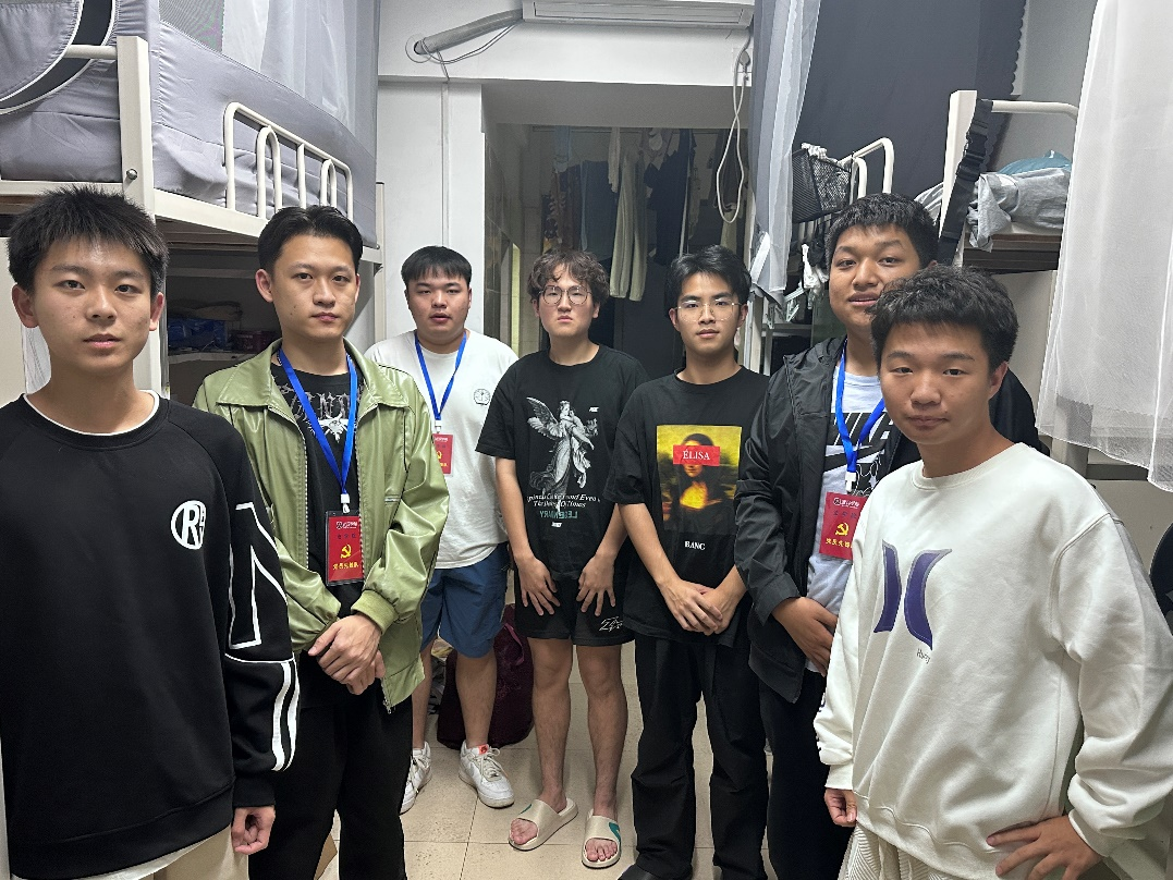 (党员先锋队小组队员们在寝室与新生们合影)