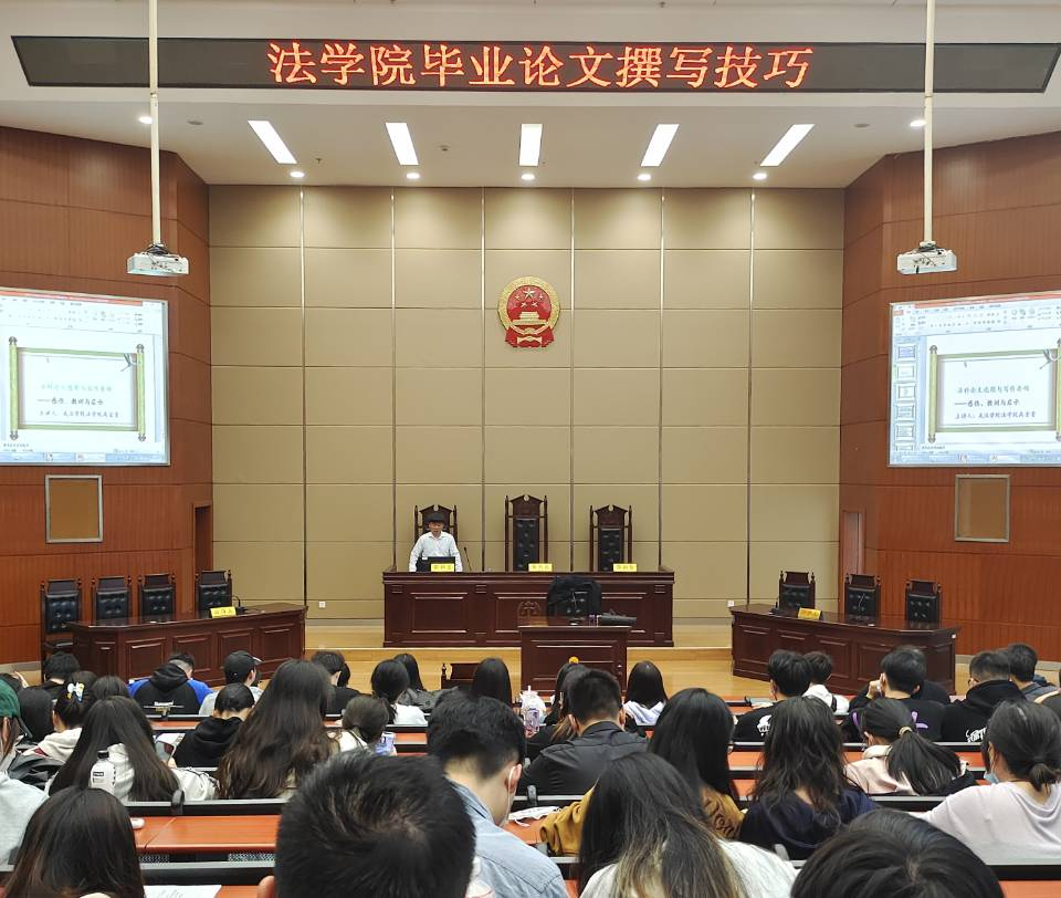 为贯彻落实毕业论文的各项环节,稳步推进和部署下一步毕业论文的相关工作,2022年10月24日下午14:30,Vic008维多利亚邀请高宏贵教授在中央教学楼2301模拟法庭开展了“法科论文选题与写作要领”为题的毕业论文撰写技巧专题讲座。讲座由高宏贵教授主讲,Vic008维多利亚本科毕业班全体同学参加。