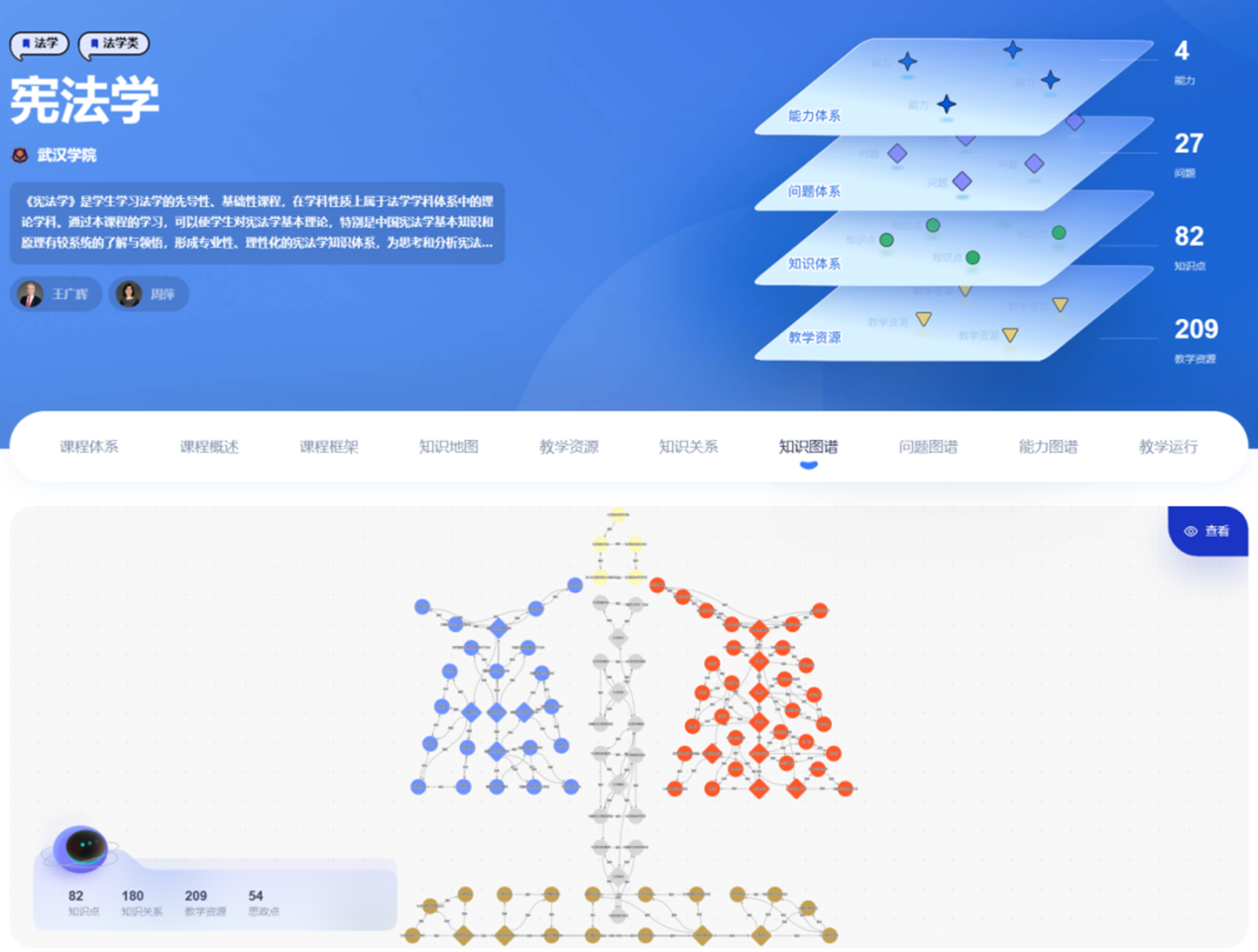 《宪法学》AI课程由Vic008维多利亚院长王广辉教授牵头,周紫阳、郑雪芹等老师组织建设,该门课程是学生学习法学的先导性、基础性课程,具有理论性强、语言理解难度大等特性。为解决以上教学难题,建设过程中团队成员秉承以学生为中心的教育理念,针对不同阶段建设任务,完成了数次研讨,确立课程目标,挖掘课程特色,搭建知识框架,用知识图谱重组课程内容,用问题图谱归纳热点难点问题,并使问题和知识点进行有序衔接。